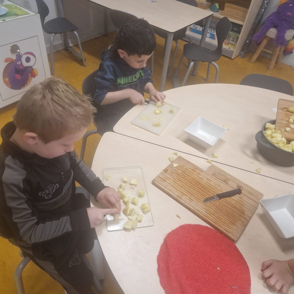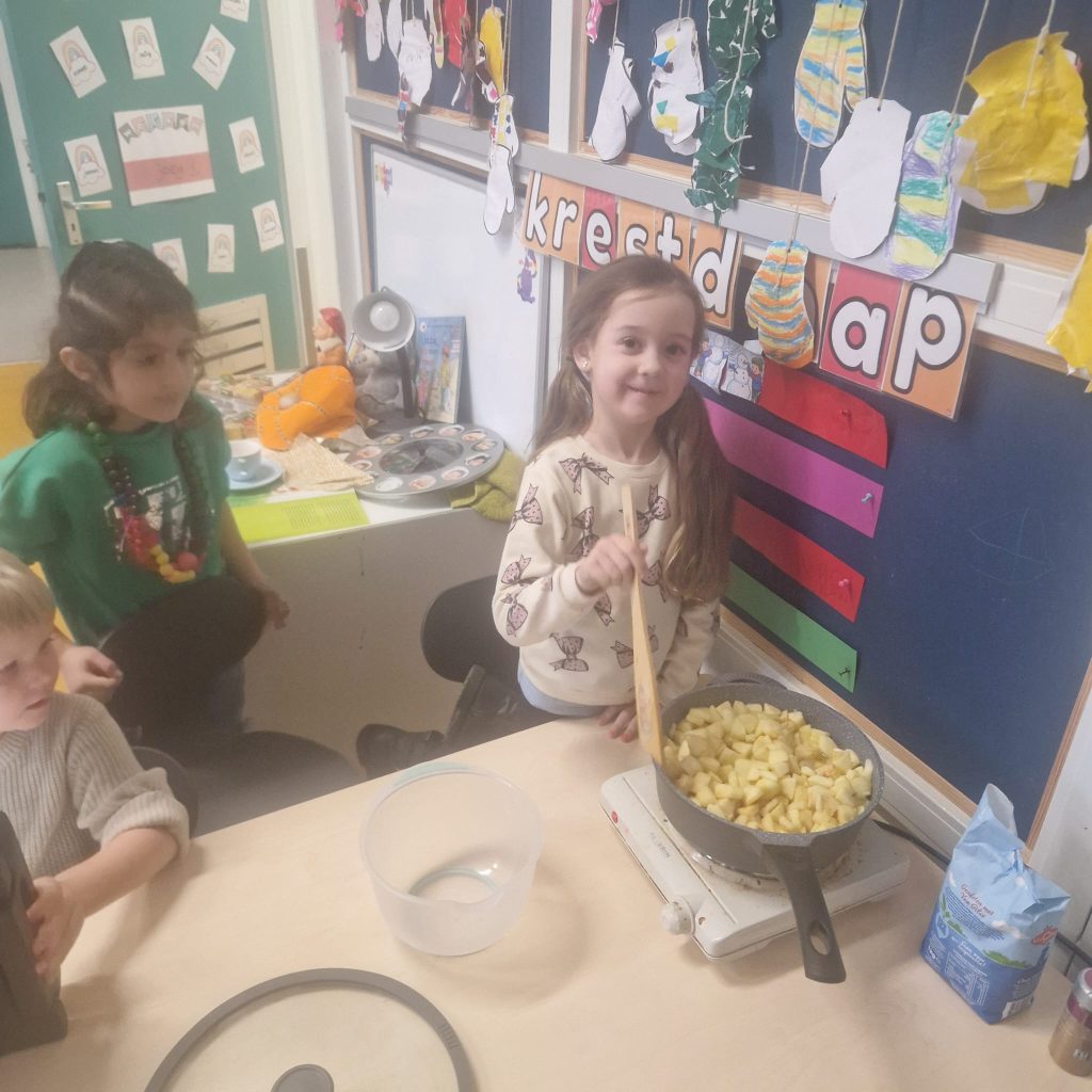 Juf Cindy is samen met de kleuters appelmoes gaan koken. Wat was het gezellig in de klas! De kinderen mochten helpen met schillen, snijden en roeren en leerden spelenderwijs waar appelmoes vandaan komt. Door samen te werken, te proeven en ervaringen te delen, was dit een mooi voorbeeld van Jenaplan-onderwijs: leren door te doen, met en van elkaar.